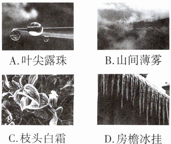 2. (305)(2024 年临沂)2023 年冬,凭借冰雪资源火爆出圈的哈尔滨吸引了众多南方游客前往游玩,千姿百态的雾凇成为游客们必看的绝世美景。下列自然现象,与雾凇形成时的物态变化相同的是(