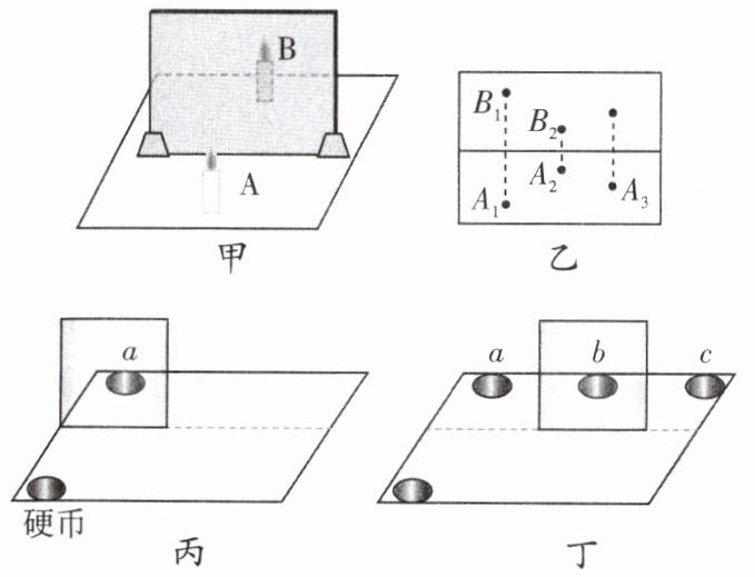 。(6)如图丙所示,小华将一枚硬币放在竖直的平面镜前,硬币的像在 a 处。她将平面镜平移至图丁所示位置时,硬币的成像情况是