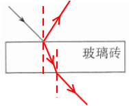 11. (403、405)一束光射向一块玻璃砖(如图),在上表面会发生反射和折射两种现象,请在图中分别画出来(注意标出法线);折射光线经玻璃砖又会从下表面射出来,再画出射出后的光线。