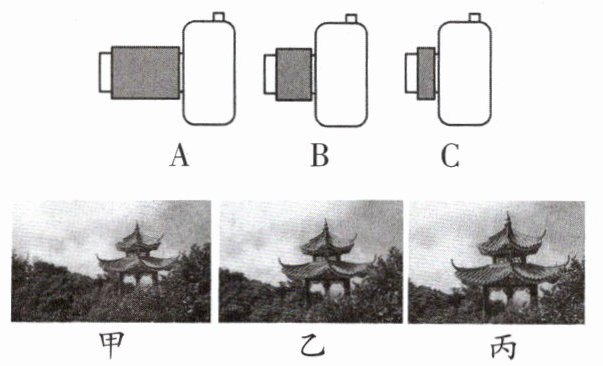 3. (509)假期里,小冬带着单反相机(镜头可以前后伸缩)在某风景区同一地点,通过调节相机镜头(如图A、B、C所示)对同一景物拍了三张照片(如图甲、乙、丙所示)。拍照时景物到相机的距离