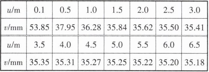 当景物在3m以外时,由表格数据可知,物距u≥3m时,像距v的值接近焦距35mm(如u=3.0m时v=35.41mm,u=6.5m时v=35.18mm),且像距变化极小(从3.0m到6.5m,v仅变化0.23mm)。由于像距变化很小,相机镜头与底片间的距离无需调节即可使像清晰,故“傻瓜”相机不需要调焦。