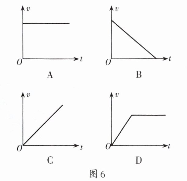 (3)用闪光照相机拍摄某一纸锥的下落过程,照相机每隔相等时间曝光一次,拍下的照片如图5所示。如图6所示的$v-t$图像中,最能反映该纸锥运动情况的是(
