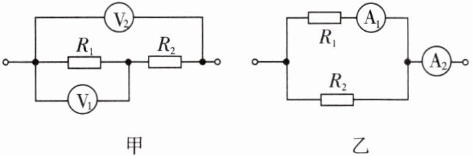 2.(1804)如图甲所示,电压表$V_1$和$V_2$的示数之比为2:3:若将电阻$R_1、$$R_2$改接为如图乙所示的电路,则电流表$A_1、$$A_2$的示数之比为