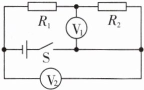 2.(1808)如图所示电路,电源电压不变,闭合开关S,电压表$V_{1}$、$V_{2}$示数之比为2:3。下列说法中正确的是(