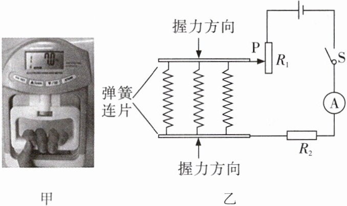 4.(1808)【物理学与工程实践】如图甲、乙所示分别为某种握力计和它的工作原理示意图。电源电压不变,握力显示表是由电流表改装而成,定值电阻$R_{2}$阻值为6Ω。不施加力时弹簧一端的滑片P在电阻$R_{1}$的最上端,移动到最下端时施加的力最大(弹簧的电阻不计)。电路中电流变化的范围为0.1~0.5 A,则下列说法中正确的是(