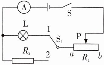 将$S_1$接2,滑片移至a端,电路中只有$R_2$,电流表示数为0.8A,电路总功率为$P_2$;