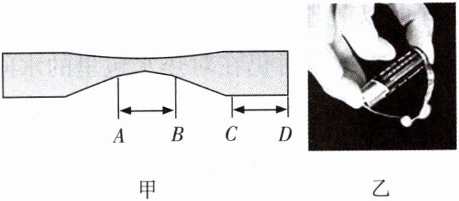 4.(1813)取口香糖锡纸,剪成如图甲所示形状,其中AB和CD段等长。戴好防护手套,将锡纸条(带锡的一面)两端连接电池正、负极,如图乙所示,发现锡纸条很快开始冒烟、着火。下列分析中正确的是(