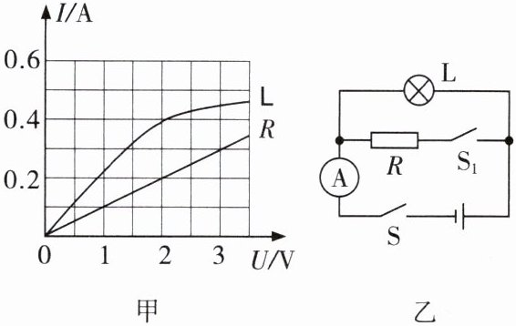 5.(1807,1808)如图甲所示是通过灯泡L和电阻R的电流随电压变化关系的图像,将它们接入如图乙所示的电路中。当只闭合开关S,小灯泡的实际功率为0.8 W,则电源电压为