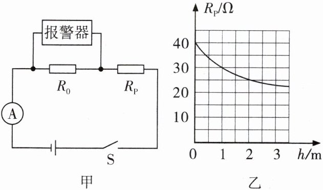6.(1808)学校开展了防溺水安全教育后,小华组经过合作探究,设计了一种可以戴在手腕上的防溺水定位求救报警器,其简化电路如图甲所示。已知电源电压为6 V,报警器由电压表改装,R₀是定值电阻,Rₚ是压敏电阻,图乙是压敏电阻阻值Rₚ随水深h变化的图像。报警器未浸入水中时,Rₚ的阻值为40 Ω,电流表示数是0.12 A;报警器浸入水下深度h大于等于1 m时,报警器报警,当h为1 m时,R₀两端的电压为1.5 V。通过计算回答: