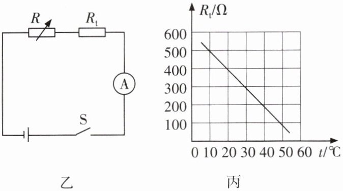 (3)由图丙知,$t = 40^\circC$时$R_t = 200\,\Omega$。电流表最大电流$I_{max}=0.02\,A$,此时总电阻$R_{总}'=\frac{U}{I_{max}}=\frac{6\,V}{0.02\,A}=300\,\Omega$,电阻箱最小值$R_{min}=R_{总}'-R_t=300\,\Omega - 200\,\Omega=100\,\Omega$。