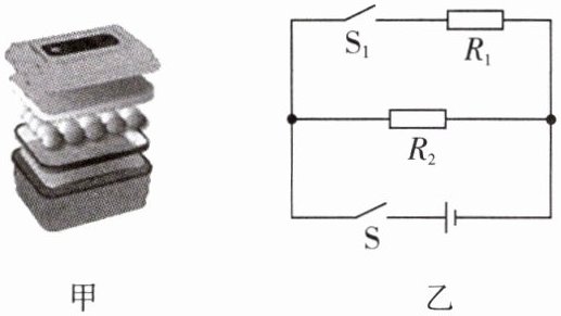 4.(1806,1811)图甲是某款鸡蛋孵化器,底部装有加热器。通电后,加热器对水加热,水向上方鸡蛋传递热量,提供孵化所需能量。孵化器简化电路如图乙,$R_{1}$、$R_{2}$都是发热电阻,孵化器相关参数如表所示。