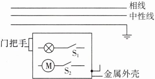 (连接示意图:相线分两支→S₁→照明灯→中性线,相线分两支→S₂→M→中性线;金属外壳→地线。)