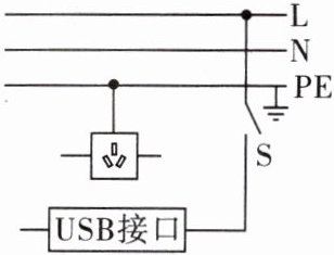 (因无法直接画图,文字描述连接方式:火线L→S→分支(插座火线端、USB火线端),零线N→分支(插座零线端、USB零线端),PE接地。)