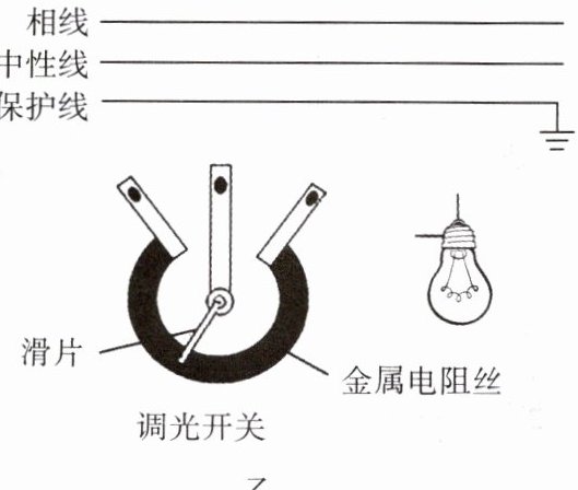 5.(1910)如图甲为亮度可调的台灯,电位器是调节其亮度的装置,电位器的内部结构示意图如图乙所示,三个接线柱,旋钮带动滑片转动。要求:把灯泡按安全用电原则接入家庭电路,当旋钮开关滑片顺时针转动时,灯泡变暗。
