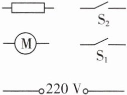 电路连接图(用笔画线表示导线):从电源正极出发,连接$S_1$,$S_1$另一端分两支,一支接$M$后回电源负极;另一支接$S_2$,$S_2$另一端接发热丝,发热丝另一端回电源负极。