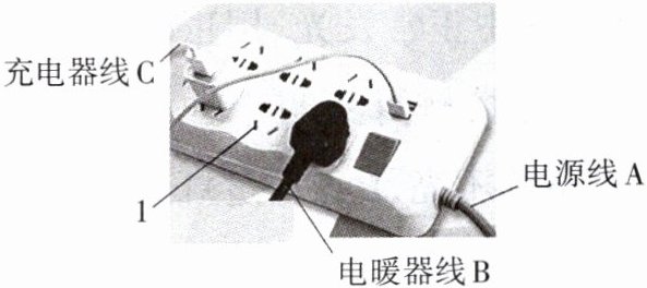 4.(1903,1907)如图所示,是一个带有开关和指示灯的家用插线板,插线板上接有正在工作的电暖器和正在充电的手机充电器,插线板规格为"250 V 10 A"。据此下列分析中正确的是(