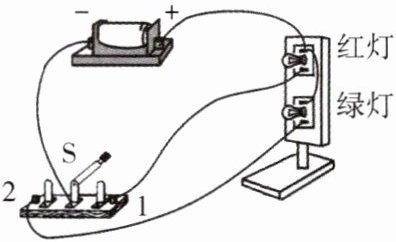 3.(1509)如图所示,小聪设计了一个红绿交通信号灯模型,当S掷1时,红灯亮,S掷2时,绿灯亮。请在虚线框内画出电路图。
