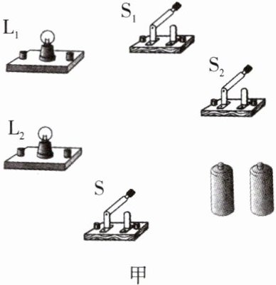 7.(1512)在如图甲所示的电路中,请用笔画线代替导线按要求将电路连接完整。并在虚线框内完成对应的电路图。(要求$:L_1$与$L_2$并联,S控制整个电路$,S_1$控制$L_1,S_2$控制$L_2,$导线不能交叉)。