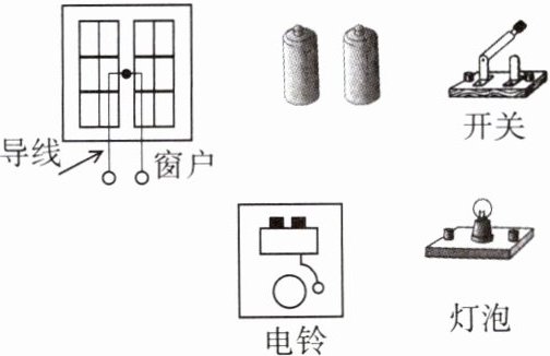 6.(1512)请用两节电池、一只灯、一个开关、一个电铃和若干细导线,设计一个家庭门窗报警电路。要求:闭合开关后,灯亮铃不响;当有人推开窗户时,两扇窗户间的导线断开,电铃便会响起来,从而报警。请按要求在虚线框中画出电路图,并连接实物图。
