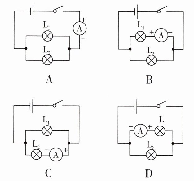 2.(1514)下列电路图中,能正确测量通过灯$L_2$电流的是(