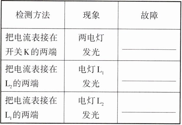 (1514)【科学推理】(1)如图所示的实物电路,闭合开关K,两只电灯都不亮,小波用电流表检测电路中发生的故障,请你帮他完成下表中的故障判断。