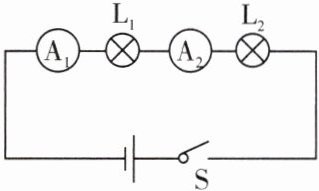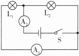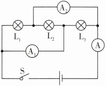 4.(1518)如图所示,闭合开关S后,电流表A的示数为3 A,电流表$A_1$的示数为2 A,电流表$A_2$的示数为2.5 A,则通过$L_2$的电流为