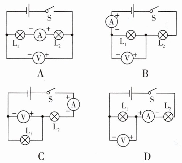 4.(1602)用电流表测通过灯$L_2$的电流,用电压表测灯$L_1$两端电压,图中电路图正确的是(