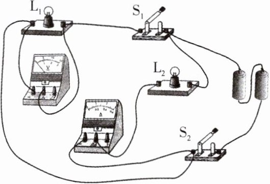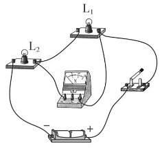 6.(1602)如图所示,请用笔画线代替导线按要求完成电路连接。要求:灯$L_1、$$L_2$串联,电压表只测量$L_1$两端的电压,不考虑电压表测量范围的选择,导线不交叉。