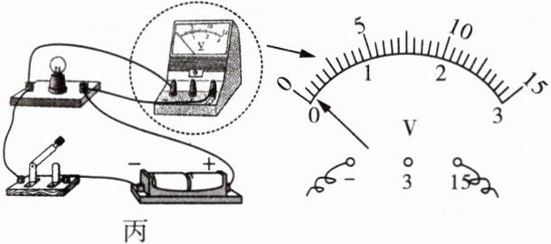 4.(1602)如图所示,用电压表测量小灯泡两端的电压,结合电压表使用说明,指出甲、乙、丙三图中电压表的使用错误。