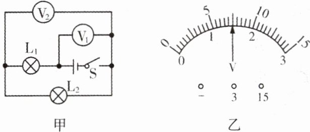 2.(1603,1604)如图甲所示电路中,当闭合开关后,两个电压表指针偏转均为图乙所示,则小灯泡$L_1$和$L_2$两端的电压分别为(