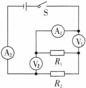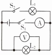 5.(1604)(2024年重庆改编)如图所示电路,电源电压保持不变$,L_1$和$L_2$是两个相同的小灯泡。先闭合开关$S_1,$记录两电表示数;再闭合开关$S_2,$发现电流表示数