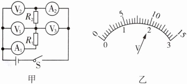 1.(1603)如图甲所示电路中,当开关S闭合时,电压表$V_1、$$V_2、$$V_3$的示数分别为$U_1、$$U_2、$$U_3,$电流表$A_1、$$A_2$的示数分别为$I_1$和$I_2($五块电表的读数均不为零),其中$V_1、$$V_2$两个电压表指针偏转均如图乙所示,则下列结论正确的是(