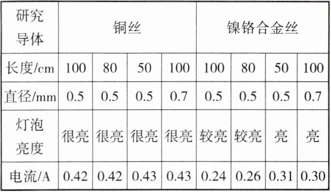 (3)分别用铜丝、镍铬合金丝进行实验,记录实验结果如下表,对比实验记录,发现用