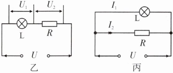 (1709,1710)(南京阶段练习)如图所示,图甲是灯泡L和定值电阻R的I-U图像,将L和R先后以乙、丙图两种方式连在一电源上,若乙图中$U_1:U_2= a$,丙图中$I_1:I_2= b$,则下列选项中不正确的是(
