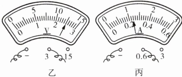 ③移动滑片P至不同位置,进行三次实验。测得第一次、第二次的电压和电流值分别为1.5 V和0.14 A、2.0 V和0.2 A,第三次电压表和电流表示数如图乙和丙所示。