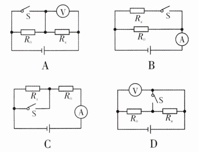 2.(1707)以下各图中,$R_{0}$阻值大小已知,不能测量出$R_{x}$电阻阻值大小的是(