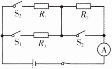 (2)开关$S_1$、$S_2$、$S_3$都闭合时,$R_2$被短路,$R_1$与$R_3$并联,电流表测干路电流。
