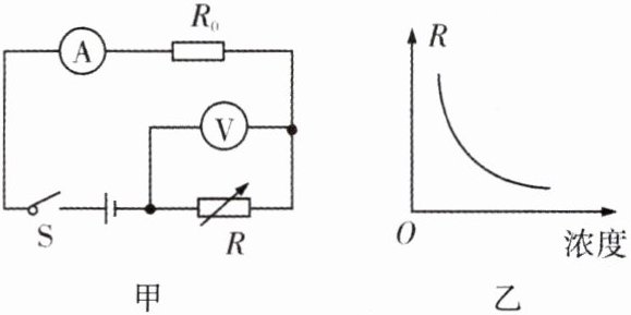 3.(1710)(2024年西宁)控制大气污染物浓度是确保空气质量,实现碧水蓝天的重要措施。如图甲是物理学习小组设计的大气污染物浓度监测简化电路。当污染物浓度增大时,污染物浓度监测表的示数增大;R为气敏电阻,其阻值随污染物浓度变化的关系如图乙所示。则下列说法中正确的是(