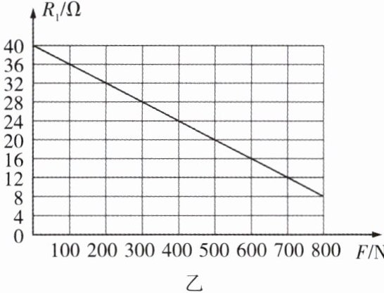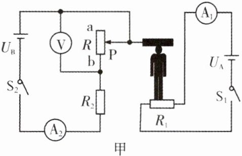 例5 (1710)如图甲是物理兴趣小组设计的身高体重测量仪的原理图。电源Uₐ的电压为3 V,电源Uᵦ的电压恒定$,R_2$为定值电阻。水平脚踏板下方有压敏电阻$R_1,$其阻值随压力F大小变化图像如图乙所示。滑动变阻器R是竖直固定放置的电阻棒,其滑片P可以随身高的变化竖直上下移动。同时闭合开关$S_1、$$S_2,$小华站在踏板上时,电流表$A_1$的示数为$0.15 A,A_2$的示数为0.3 A,此时滑片恰好在R的中点,电压表示数为3 V;小明站在踏板上时,电压表示数为3.6 V,电流表$A_2$的示数为0.24 A。问: