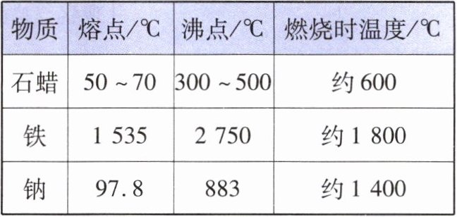 |物质|熔点/℃|沸点/℃|燃烧时温度/℃|