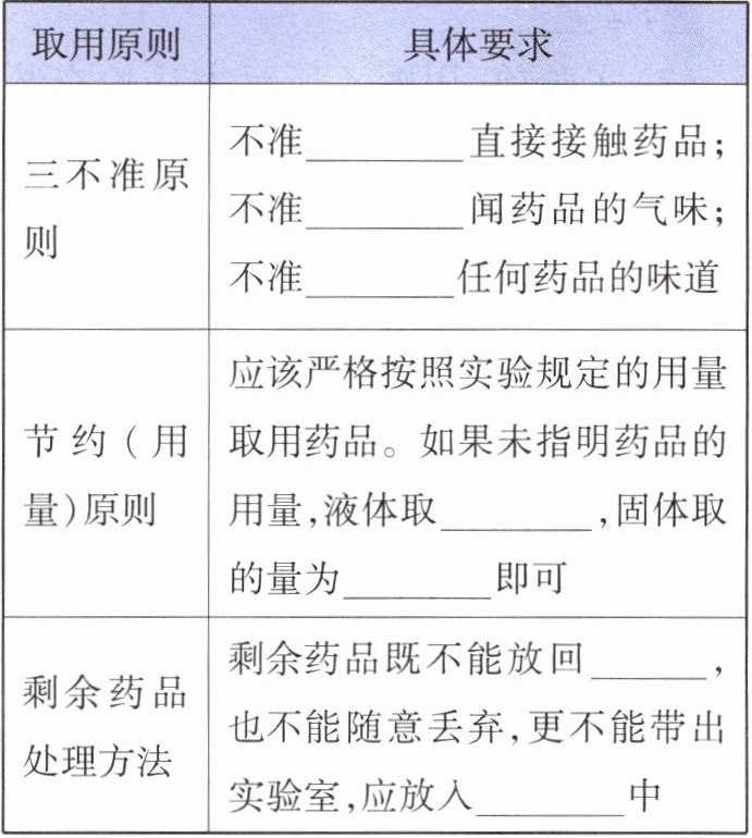 任何药品的味道||节约(用量)原则|应该严格按照实验规定的用量取用药品。如果未指明药品的用量,液体取