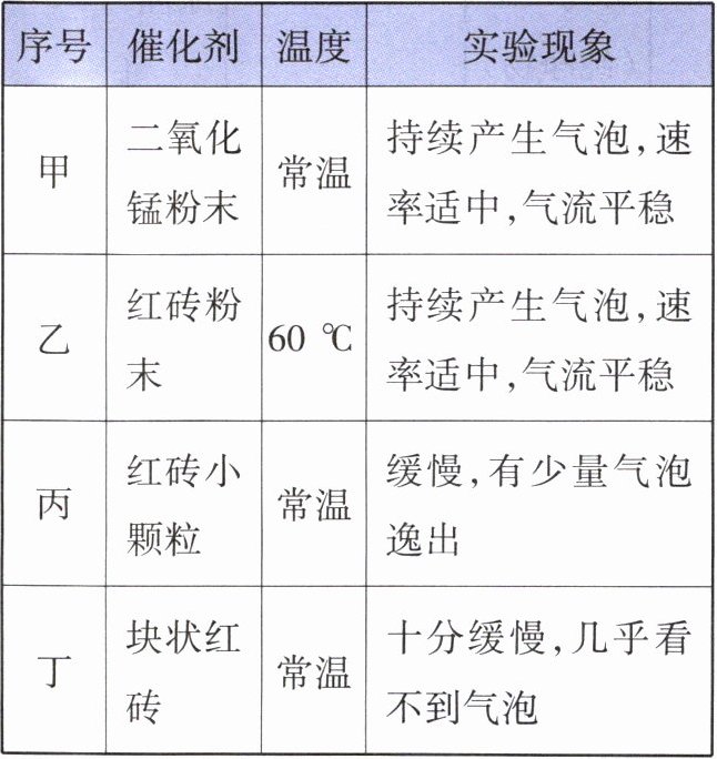 ④在一定温度下,另取2g红砖小颗粒,向其中加入8%的过氧化氢溶液20mL,继续实验,发现产生气泡的速率明显比实验丙快。请分析可能的原因(至少写两条)