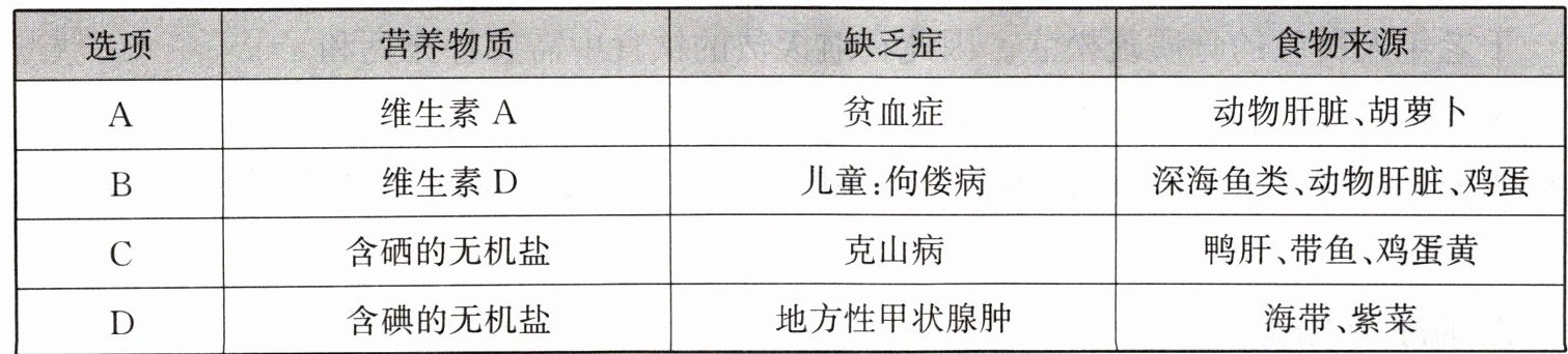 10. 每年5月20日为中国学生营养日,目的在于广泛、深入宣传学生时期营养的重要性。下表中对应关系错误的是(