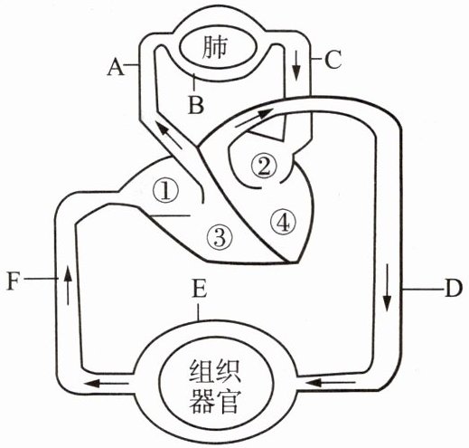 15. 下图为人体血液循环(部分)示意图,①~④分别代表心脏的四个腔,A~F分别代表不同的血管,请据图回答下列问题。
