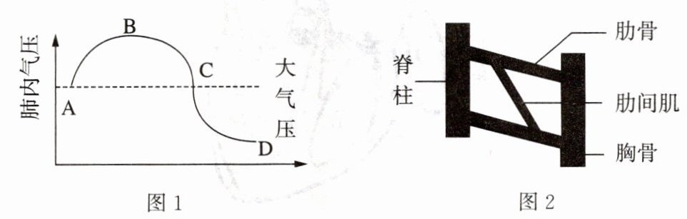 24. 深呼吸能够缓解人的紧张情绪。图 1 曲线表示人体呼吸过程中某阶段的肺内气压变化,图 2 为模拟呼吸过程中肋间肌的舒缩引起有关骨运动的模型。下列关于曲线叙述正确的是(