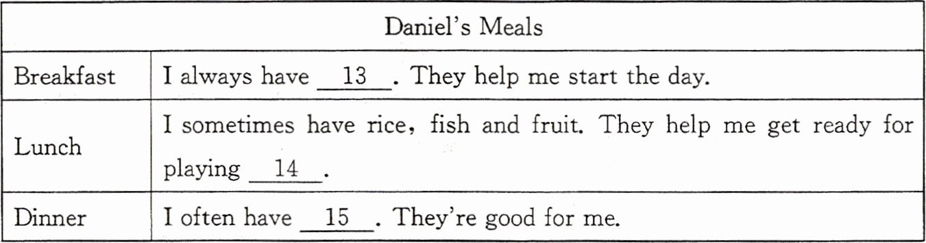 )13. A. hamburgers, eggs and milkB. bread, fruit and orange juice