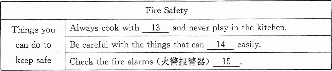 |Things you can do to keep safe|Always cook with 13 and never play in the kitchen.Be careful with the things that can 14 easily.Check the fire alarms (火警报警器) 15 .|