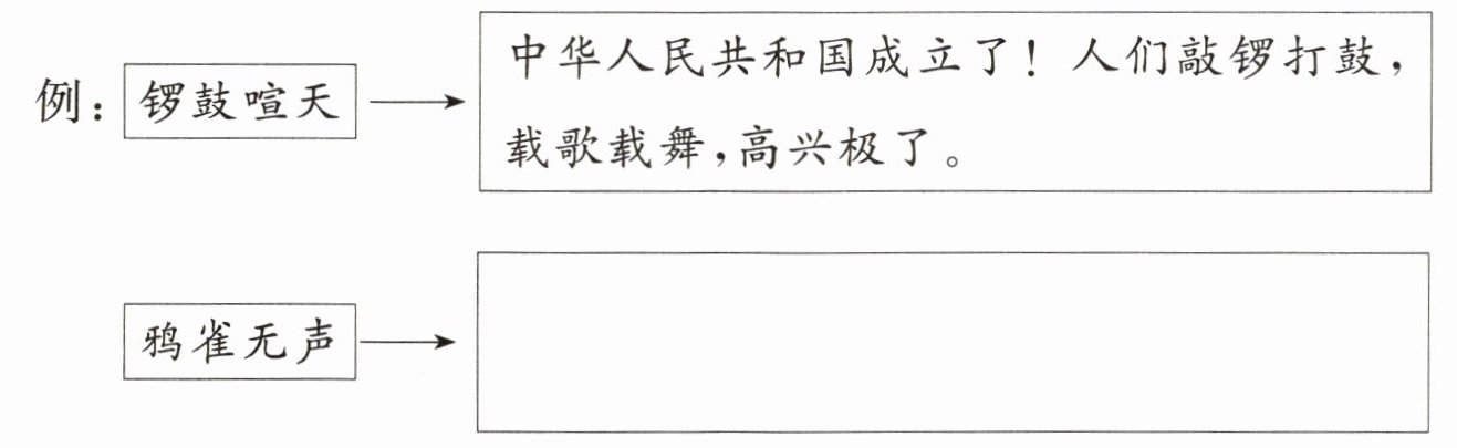 例:锣鼓喧天→中华人民共和国成立了!人们敲锣打鼓,载歌载舞,高兴极了。