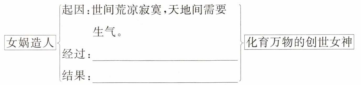 | 女娲造人 | 起因:世间荒凉寂寞,天地间需要生气。 | 化育万物的创世女神 |