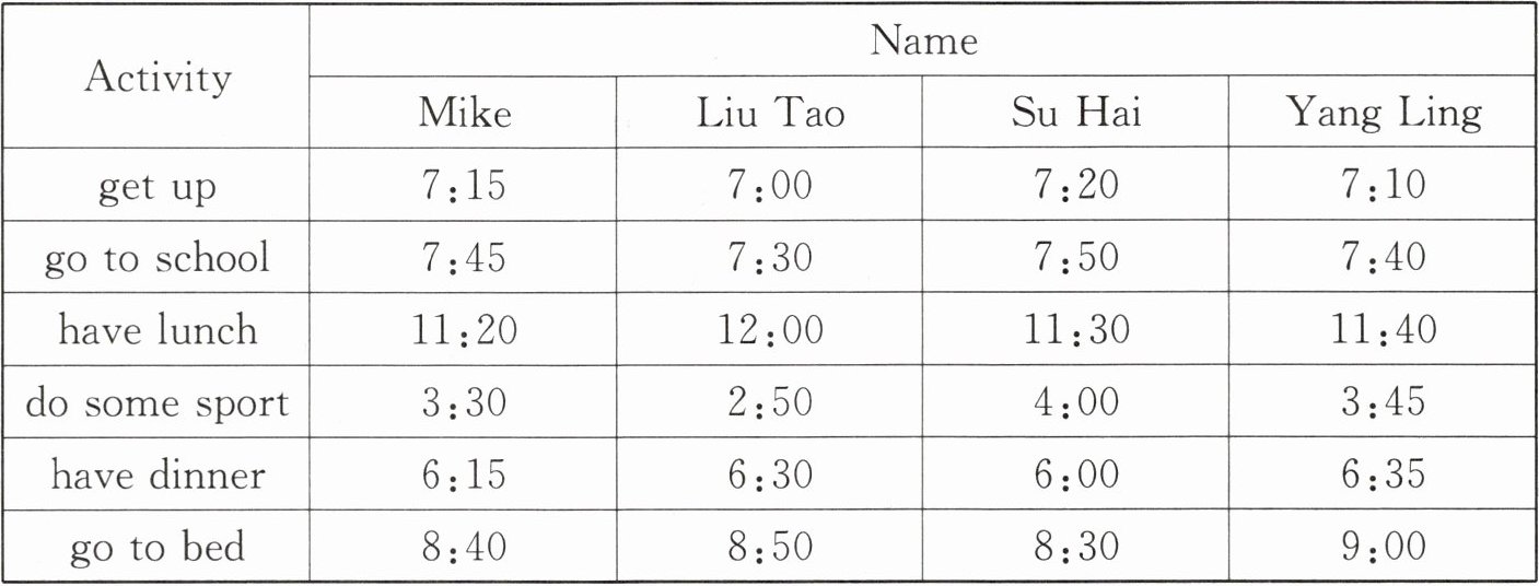 | | Mike | Liu Tao | Su Hai | Yang Ling |